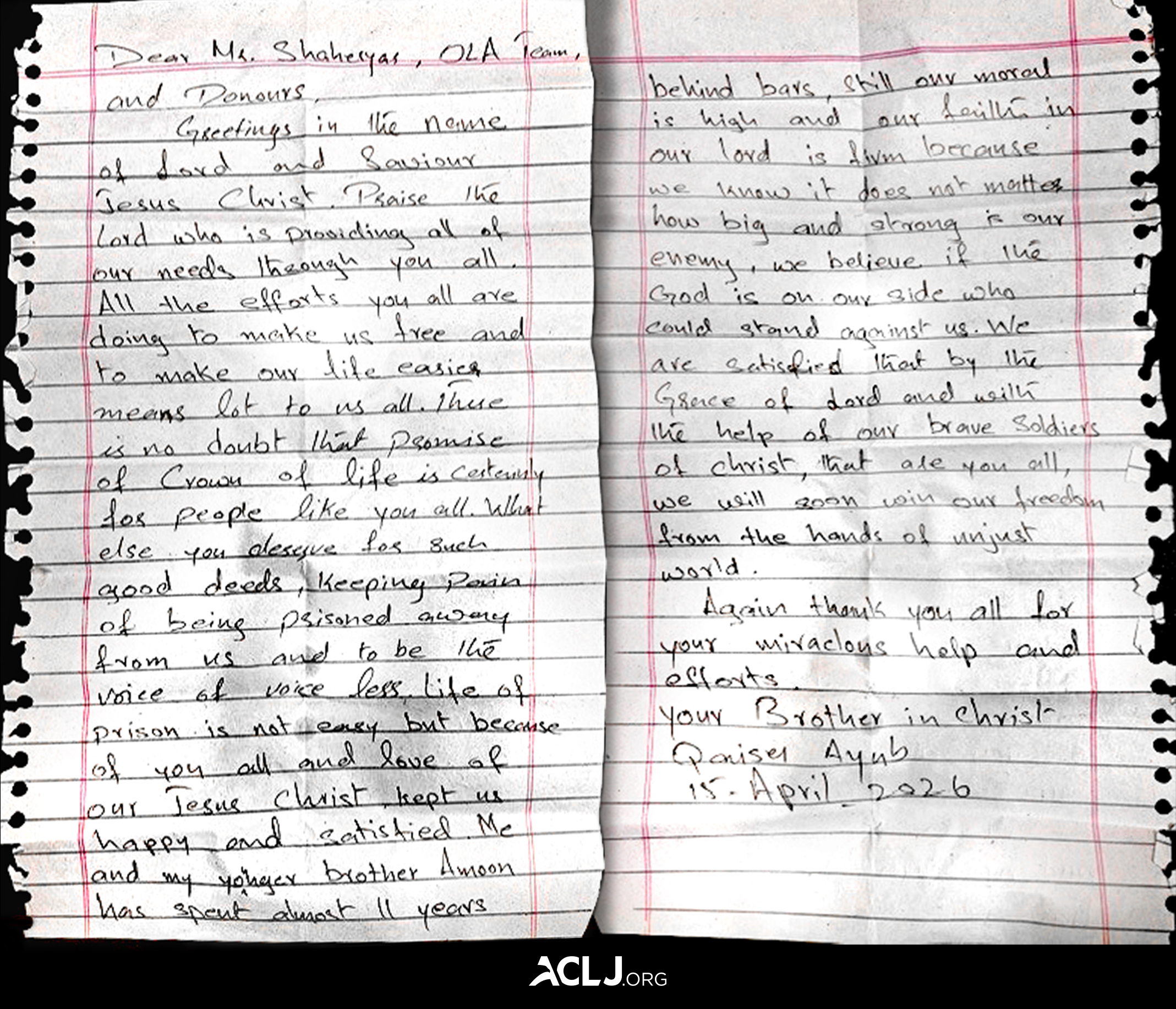 Greetings in the name of Lord and Saviour Jesus Christ. Praise the Lord who is providing all of our needs through you all. All the efforts you all are doing to make us free and to make our life easier means lot to us all. There is no doubt that promise of crown of life is certainly for people like you all. What else you deserve for such good deeds, keeping pain of being imprisoned away from us, and to be the voice of voiceless. Life in prison is not easy, but you all and love of our Jesus Christ kept us happy and satisfied. Me and my younger brother Amoon have spent almost 11 years behind bars. Still our morale is high and our faith in our Lord is firm because we know it does not matter how big and strong is our enemy. We believe if God is on our side, who could stand against us? We are satisfied that by the grace of Lord and with the help of our brave soldiers of Christ, that are you all, we will soon win our freedom from the hands of unjust world.
